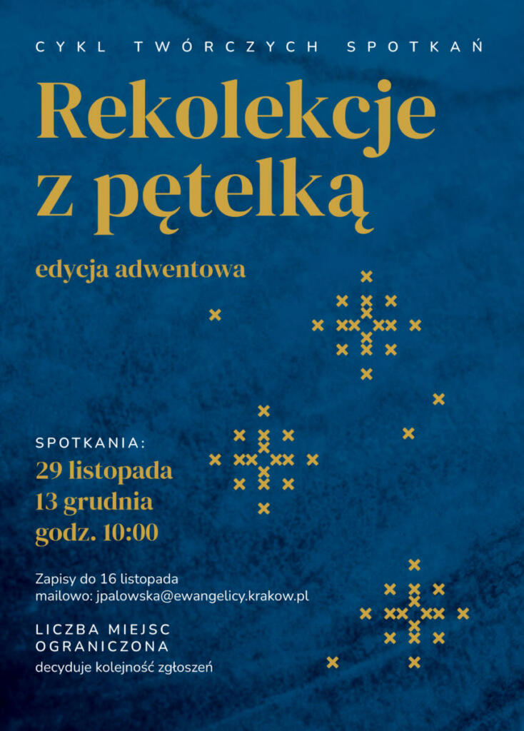 Cykl spotkań „Rekolekcje z pętelką” to chwila zatrzymania w pędzie życia, gdzie duchowość łączy się z twórczą aktywnością. To przestrzeń, gdzie Twoja wrażliwość, kreatywność i artystyczna ekspresja w połączeniu z adwentową refleksją może stać się sposobem na spotkanie z Wcielonym Bogiem.