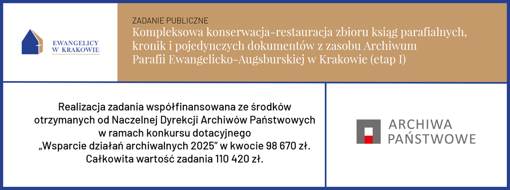 Zadanie publiczne pt. „Kompleksowa konserwacja-restauracja zbioru ksiąg parafialnych, kronik i pojedynczych dokumentów z zasobu Archiwum Parafii Ewangelicko-Augsburskiej w Krakowie (etap I)” zrealizowano w okresie od lipca do grudnia 2025 roku. Zostało ono sfinansowane w większości ze środków pozyskanych w ramach konkursu dotacyjnego „Wspieranie działań archiwalnych” organizowanego przez Naczelną Dyrekcję Archiwów Państwowych (89,35%), z wkładem własnym Parafii wynoszącym 10,64% budżetu.