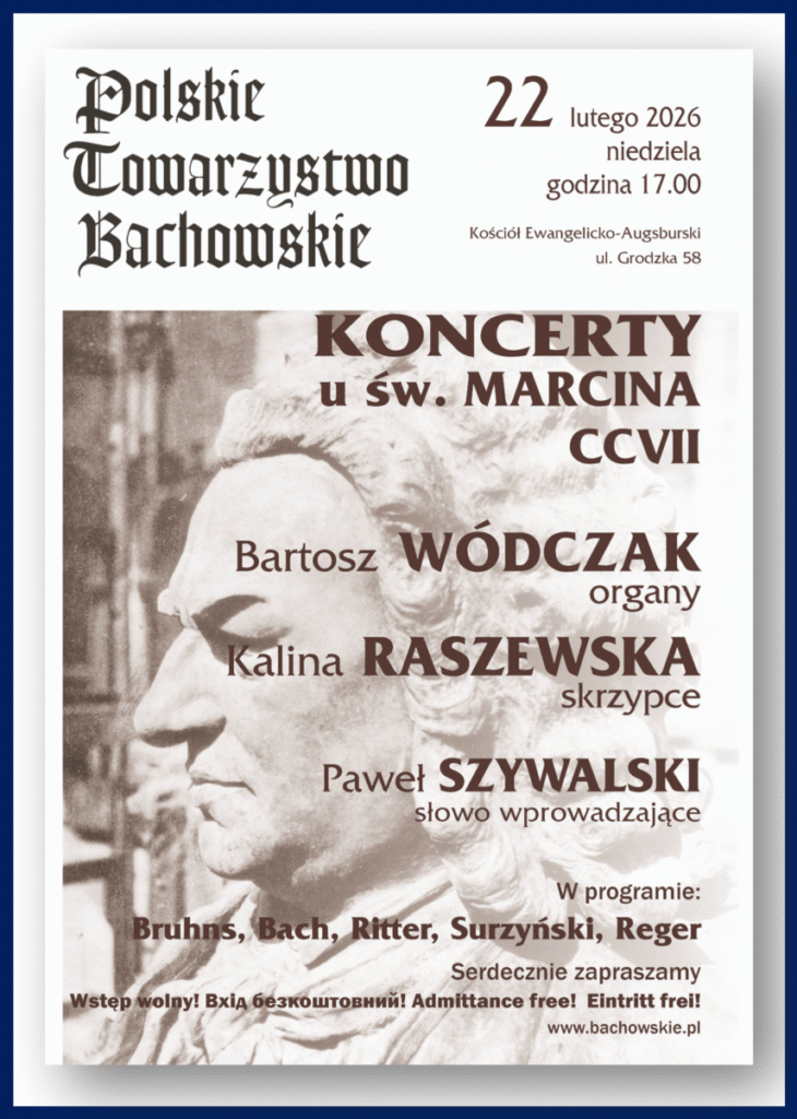 W niedzielę 22 lutego 2026 o godzinie 17:00 kolejny w tegorocznej edycji koncert Polskiego Towarzystwa Bachowskiego w naszym kościele (Grodzka 56). Zapraszamy!