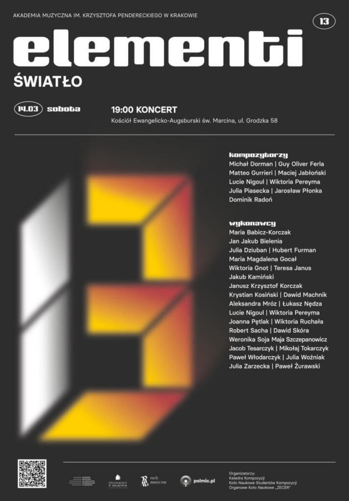 Wszystko to podczas koncertu, który odbędzie się w sobotę 14 marca 2026 o godzinie 19:00. Koncert jest elementem dorocznego wydarzenia Elementi, organizowanego przez studentów i doktorantów Akademii Muzycznej im. Krzysztofa Pendereckiego w Krakowie (AMKP).