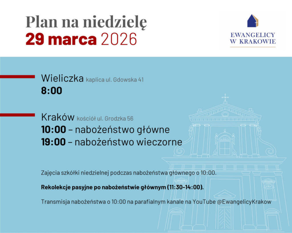 > Transmisja nabożeństwa głównego na parafialnym kanale na YouTube @EwangelicyKrakow: https://www.youtube.com/watch?v=XUpjc0jIEbs.