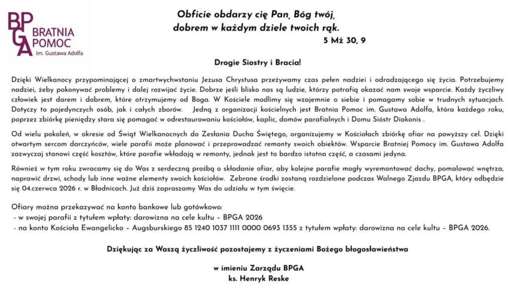 Wpłat można dokonywać w Kancelarii parafialnej (gotówką) lub przelewem na rachunek bankowy Parafii nr 46 2490 0005 0000 4530 5126 4142 z dopiskiem „darowizna na cele kultu – BPGA 2026”.