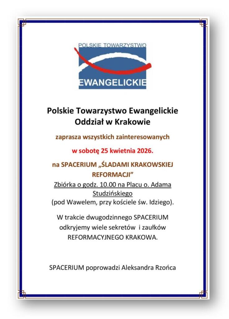 Polskie Towarzystwo Ewangelickie Oddział w Krakowie zaprasza wszystkich zainteresowanych w sobotę 25 kwietnia 2026 na SPACERIUM „ŚLADAMI KRAKOWSKIEJ REFORMACJI”.