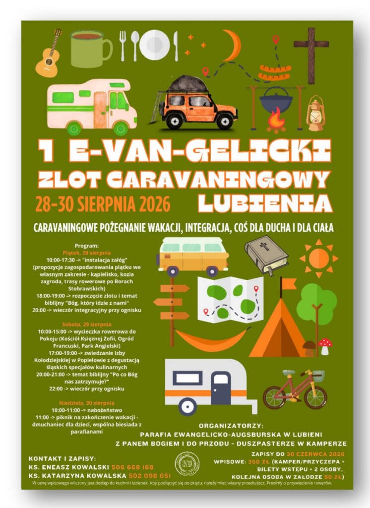 Jeśli jesteś fanem caravaningu, Parafia Ewangelicko-Augsburska w Lubieni oraz „Z Panem Bogiem i do przodu – duszpasterze w kamperze” zapraszają na 1. E-van-gelicki Zlot Caravaningowy Lubienia 2026!