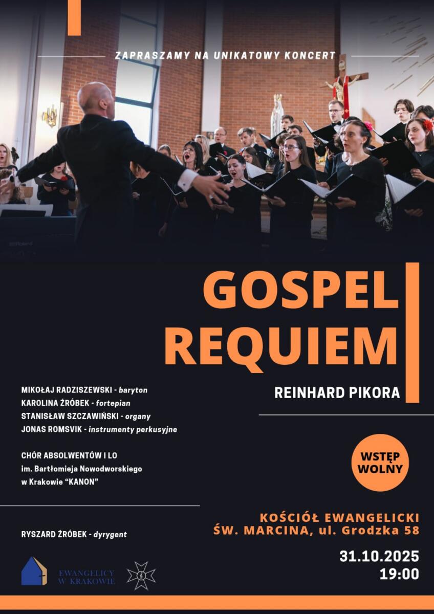 Zapraszamy na koncert Chóru Absolwentów I Liceum Ogólnokształcącego im. Bartłomieja Nowodworskiego w Krakowie, który wystąpi pod dyrekcją Ryszarda Źróbka. Chór wykona utwór „Gospel Requiem” autorstwa niemieckiego, ewangelickiego księdza Reinharda Pikory….