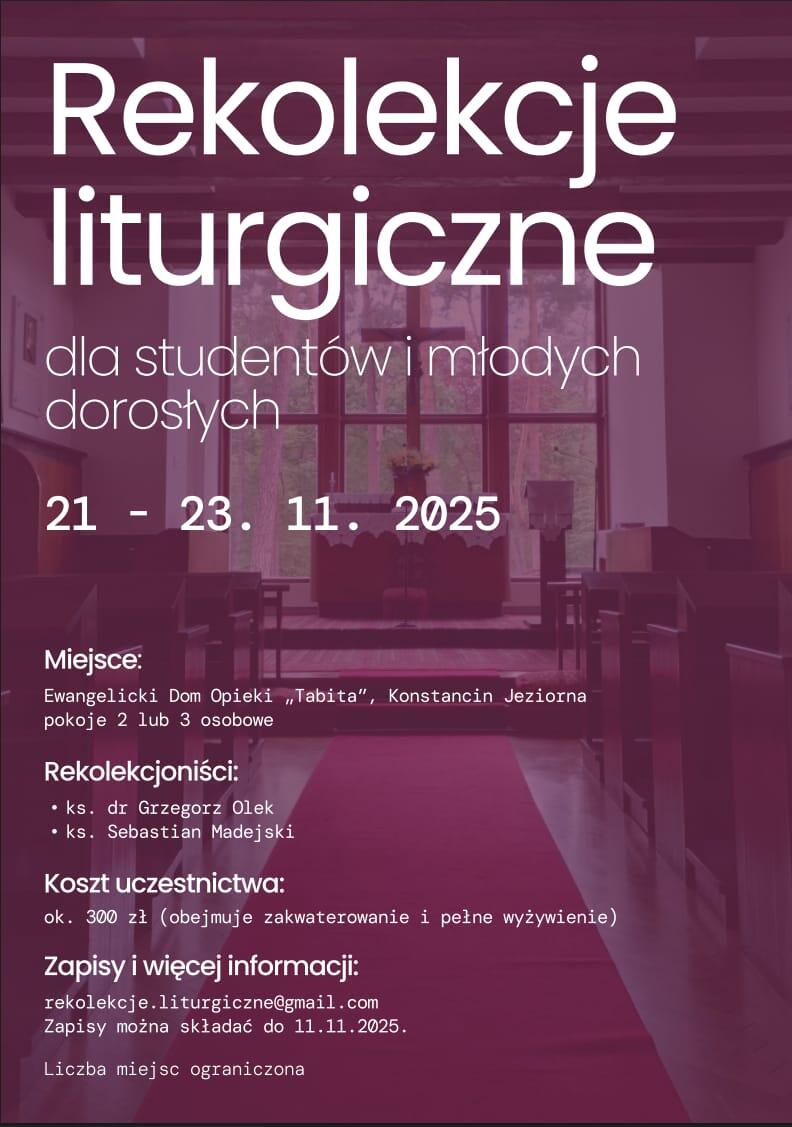 W imieniu organizatorów zapraszamy do Konstancina-Jeziorny na niezwykłe rekolekcje liturgiczne.Rekolekcje dedykowane są przede wszystkim do studentów i młodych dorosłych. Rekolekcjonistami będą ks. dr Grzegorz Olek oraz ks. Sebastian Madejski. Kiedy?…