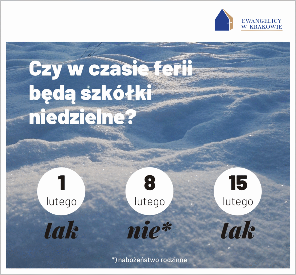 Czy w okresie ferii zimowych będą się odbywać zajęcia szkółek niedzielnych? 1 lutego – TAK, podczas nabożeństwa głównego o 10:00 8 lutego – NIE, ze względu na nabożeństwo rodzinne o…